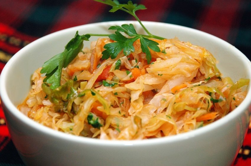 - В разогретую с маслом сковороду положить капусту и морковь, протушить 5–7 мин.